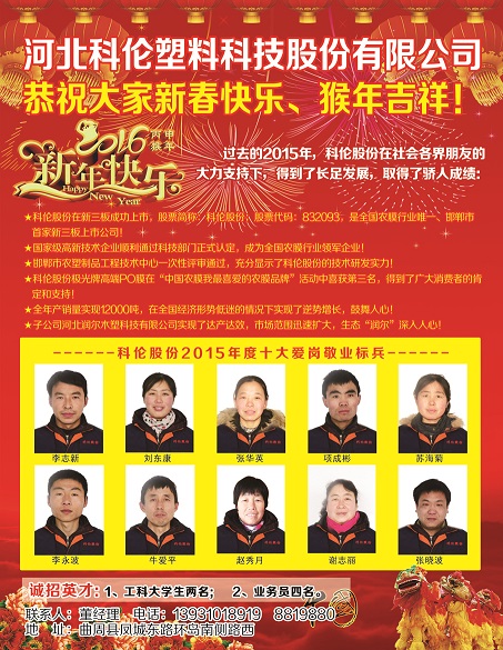 點擊數:72182016-01-28 08:30:38 來源: 科倫塑業集團股份有限公司|農用薄膜|po膜|轉光膜|EVA消霧膜|高效日光膜|棚膜|地膜|包裝膜|土工膜|